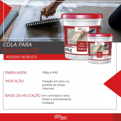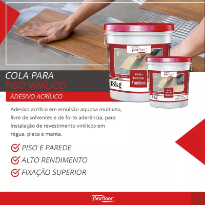 A Cola Super Tack para Piso Vinílico FlexFloor é um produto adesivo acrílico em emulsão aquosa multiuso, livre de solventes e com forte aderência. É indicado para a instalação de revestimentos vinílicos heterogêneos e homogêneos em manta e revestimentos têxteis com bases comuns (látex, PVC e espuma de poliuretano, juta natural e action Bac, Etc.). Com média viscosidade, é facilmente aplicável com espátula A2 e A4 em bases porosas e não porosas.