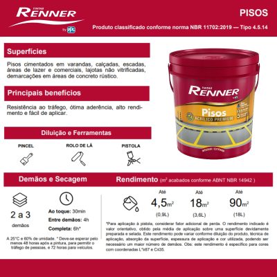 - Resistência Superior: A Tinta Pisos Renner protege seus pisos contra intempéries e suporta facilmente o tráfego intenso. Com isso, você garante que suas superfícies fiquem sempre bem conservadas.